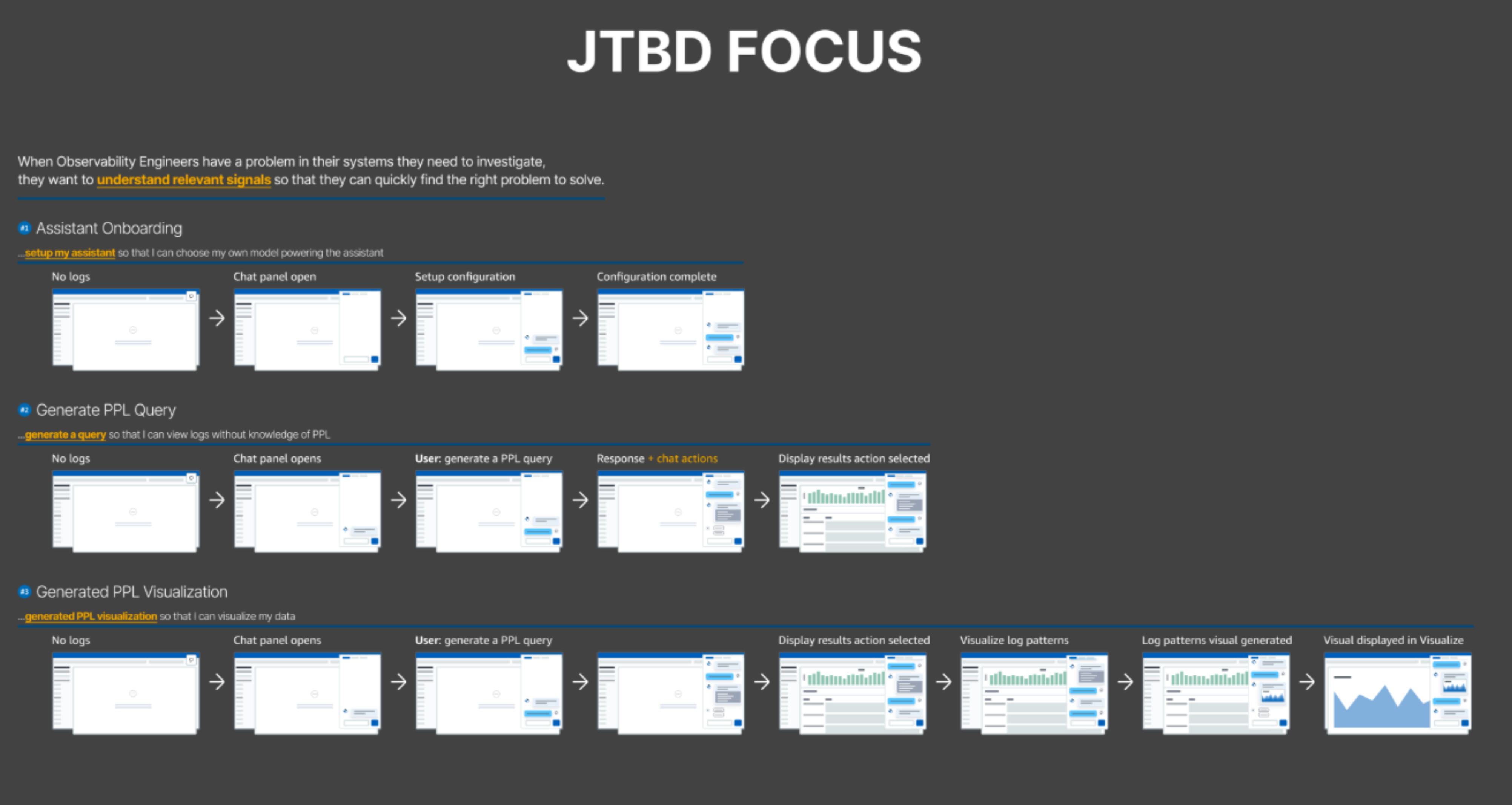 When AWS announced its 2024 AI integration initiative, the OpenSearch Observability team faced a foundational challenge: reimagining DevOps workflows through the lens of generative AI. Building on a year of experience designing AI-driven search comparison tools, I spearheaded the discovery phase—mapping the intersection of machine learning capabilities and practitioner needs through strategic JTBD frameworks.